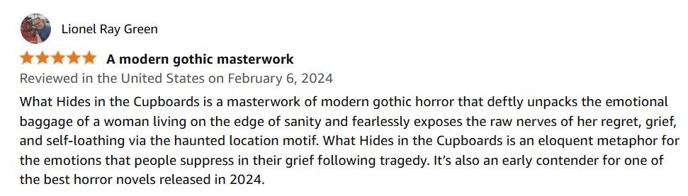 Released in January 2024 by Unnerving Books, What Hides in the Cupboards has 14 reviews with a 4.4 (out of 5) rating on Amazon plus an additional 32 reviews with a 4.3 rating on Goodreads as I write this. One of the Amazon reviews is mine, and it reminded me of how much the novel impressed me at the time. After finishing it, I immediately thought, “That may be one of the best novels I’ll read in 2024.”
